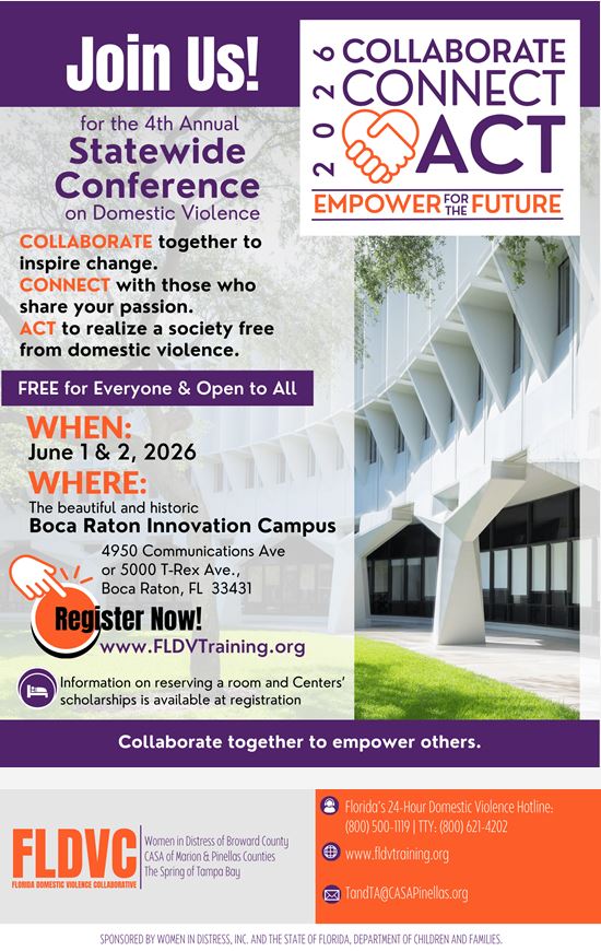 Increase your knowledge with us! The Florida DV Collaborative provides FREE virtual “on-site” training events to organizations and communities on various topics. FLDVC also provides in-person training and technical assistance. FLDVC has NO membership fee for participating in any of our opportunities.
